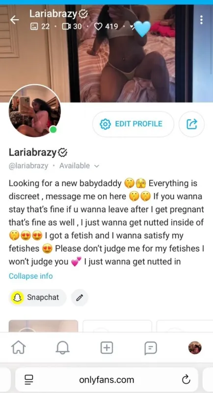 I'm currently looking for a new babydaddy ๐คซ๐คซ๐ฅฐ My last 2 baby daddies are literally no where to be found but its fine ๐ I been having this secret fetish for a long time ,Dont miss me this time , this is my 3rd time finding a random person to be my baby daddy ! Everybody be wondering who my last 2 are but Shit idk who they are my damn self ๐ฆ I have a serious fetish of getting nutted inside of by random men and raising their babies no strings attatched ๐ฉ๐ ( P.s HIT ME UP ON ONLYFANS ONLY ๐ I DON'T RESPOND TO PEOPLE TEXTING MY PHONE NUMBER ๐ THE POLICE ARE ACTIVE ON IMESSAGE ETC , IF U DON'T HAVE ONLYFANS THEN MAKE ONE DADDY AND HMU ๐ NO LAW ENFORCEMENT ! HMU DISCREETLY ON ONLYFANS ๐คค๐คค ) At the time of me writing this its FREE , but that may change soon ! Add me daddy ๐๐คค I be horny as fuck like all of the time and I'm ready to have another baby , my last 2 babies are 4 years old and a 1 year old its been long enough I need to get nutted inside of again ๐ฉ๐ฉ I dont care if your dick is small or large I just want cum inside of me simple ! I'm a freaky ass bitch and prolly the sexiest freak u gonna find i'm all yours Dada ๐คซ๐คค AFTER I get pregnant we can keep fucking for free if u want I'll always wanna fuck my babydaddy's ๐ซฃ๐คค I love when that warm cum is inside of my wet pussy it feels so good like omg ๐ฉ๐ฅบ๐ If u interested hit me up daddy ๐ I'm super fertile and im looking for a freak thats just like me ๐๐ I been escorting for 6 years and So far I have 2 baby daddies I only met them once , I'm so fertile rn I been wet n horny asf like every day lately ๐ฉ๐ฆ My pussy tight as fuck and My head 10/10 but don't nut inside of my mouth do it in my pussy no condoms no birth control ๐๐ฉ๐ฉ If u wanna talk to me DO NOT text my phone number I won't respond ๐ daddy ๐ Text me on Onlyfans ONLY if u interested in getting me pregnant ๐คซ๐๐ฆ My onlyfans name is @ Lariabrazy Text me on onlyfans ONLY daddy, I respond FAST ASF on there ! I don't respond to people texting my phone number, I use that for my personal life ๐๐ฅฐ Serious freaks ONLY NO MINORS ! Cum in me ๐ฆ Get me pregnant ๐คฐ๐ฝ And leave โ๐ฝ or stay ๐( preferably I want you to stay ๐) @Lariabrazy hit me up on OF Dada ๐คค๐คค If you dont have one make one ๐ฅฐ๐คซ๐คซ Also, I'm disease free currently ๐and i'm Fertile asf right now ๐คค๐ฉ