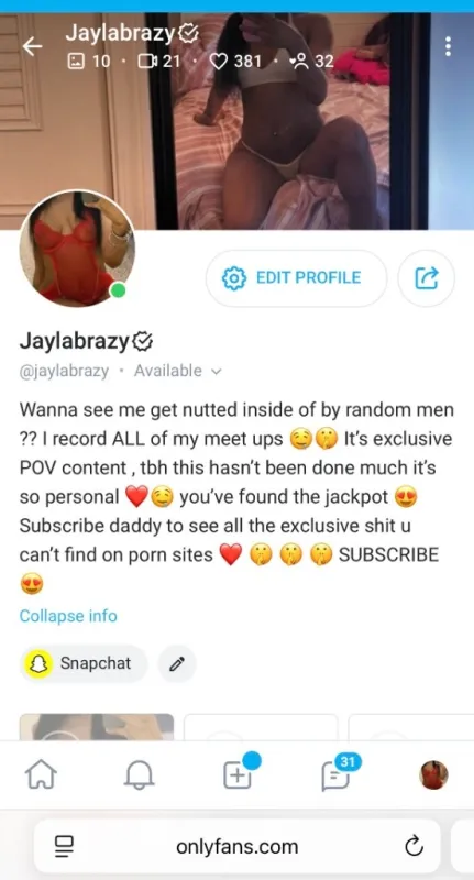 I have a breeding fetish π©π© Like real bad ! Sorry if I'm too freaky Dada π€€π© I just love getting prego by random guys this gonna be my 3rd time π€€ ADD ME ON SNAPCHAT π©·π¦ Do NOT text or call my phone baby! Message me on snapchat or onlyfans ONLY I reply fasst on there ππ©· Breeding sessions Let me make you cum dada ππ€€ I'ma gentle freak and I wanna have a good time with somebody as freaky as me π€€ Im petite, i'm fine asf and I'm always down for a good time β€π© I'm fertile asf and I'm looking for my new baby daddy π€€π You can stay or leave its up to you I just wanna fuck π©π« We all have our fetishes so dont judge me daddy π©β€ I had my last 2 kids from meet ups and My last 2 baby daddies no where to be found Idc tho I want more π€€ Im prolly the freakiest and baddest bitch on here tbh and yall don't wanna miss this again π come fuck me before I get knocked up again and taken off the market β€ Hit me up if u wanna breed im down for whatever π¦ I love when that warm cum creampies my wet pussy it feels so good π€€π€€ I been wanting to feel that feeling again omg π© Text me dada before somebody snatches me up π©β€ My socials β€ β¬β¬ No judging my fetishes please π I just wanna get slutted out π€€ Stay or leave its your choice daddy, I just want cum inside of me π© DONT CALL OR TEXT MY PHONE NUMBER, TEXT OR CALL ME ON SNAPCHAT ONLY PLEASE AND THANKS π©·π©· Snapchat π» - @ JaylaBrazy47 Onlyfans π¦ - @ Jaylabrazy